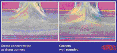 如果給一個有的組件以負載,則的底部可能會產(chǎn)生應力。在這一部位如果沒有圓弧,可能會產(chǎn)生非常高的應力集中(見圖3),通常會導致組件的斷裂和報廢。補救措施是建立一個半徑足夠大的圓。▓D1),使肋底部建立更好的應力分布。