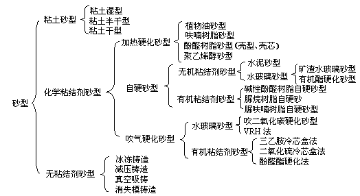 鑄造主要工藝過程包括:金屬熔煉、模型制造、澆注凝固和脫模清理等。鑄造用的主要材料是鑄鋼、鑄鐵、鑄造有色合金(銅、鋁、鋅、鉛等)等。鑄造方法常用的是砂型鑄造,其次是特種鑄造方法,如:金屬型鑄造、熔模鑄造、石膏型鑄造......等。而砂型鑄造又可以分為粘土砂型、有機(jī)粘結(jié)劑砂型、樹脂自硬砂型、消失模等等,如下圖: