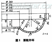 我廠生產(chǎn)的YJH256液力變矩器泵輪外環(huán)(見(jiàn)圖1),就屬于此種類(lèi)型零件,為適應(yīng)生產(chǎn)需要,設(shè)計(jì)了如圖2所示的拉深模具。