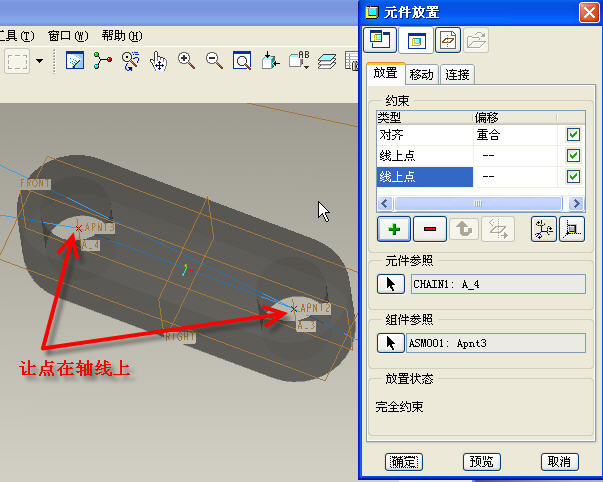 6.組建chain1,讓chain1的top與 Asm_top重合,讓軸線過第一、二基準(zhǔn)點