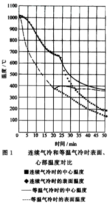 形狀復雜的較大工件從高溫連續(xù)進行快速冷卻時容易產(chǎn)生變形甚至裂紋。以往可用鹽浴等溫淬火解決。在單室真空高壓氣冷淬火爐中能否進行氣冷等溫淬火呢?圖1為在帶有對流加熱功能的單室高壓氣冷淬火爐中對兩組φ320mm×120mm兩塊疊裝的碳素結構鋼用不同冷卻方式淬火后的對化結果。圖中一組曲線是在102O℃加熱后,在6×105Pa壓力下連續(xù)用高純氮氣冷卻(風向是上、下相互交替,40s切換一次)的結果。另一組是對試樣表面、心部進行370℃時的控制冷卻。從兩組曲線的對比可以看出,心部溫度通過50O℃的時間(半冷時間)只差約2min。從表面進行控制冷卻開始到心部溫度到達370℃附近,需27min。由此可見,在單室真空高壓氣淬火爐進行等溫氣冷淬火是可行的。